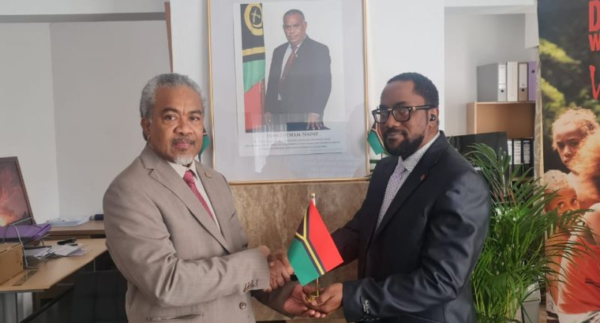 Vanuatus Trade Commissioner, Ambassador Prof. Hugh K Aryee in a Photograph with Hon MP, Hon. Jesse Luo and HE Ambassador Georges Maniuri after a brief meeting on trade and bilateral discussions in Brussels.